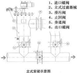 全自動過濾順路應水平或垂直安裝,同時應注意進水方向與外殼箭頭方向應一致。(見安裝示意圖)